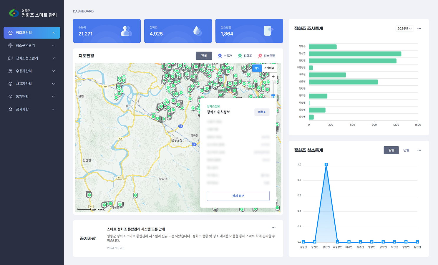 지도 기반으로 모든 정화조 현황을 실시간 모니터링하고 통계를 확인합니다.