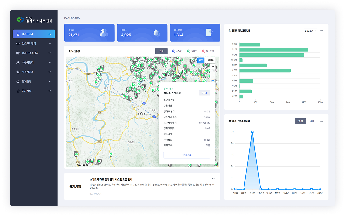 지도 기반으로 모든 정화조 현황을 실시간 모니터링하고 통계를 확인합니다.
