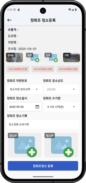 • 실시간 정화조 청소 현황 등록 및 지도 표시 기능